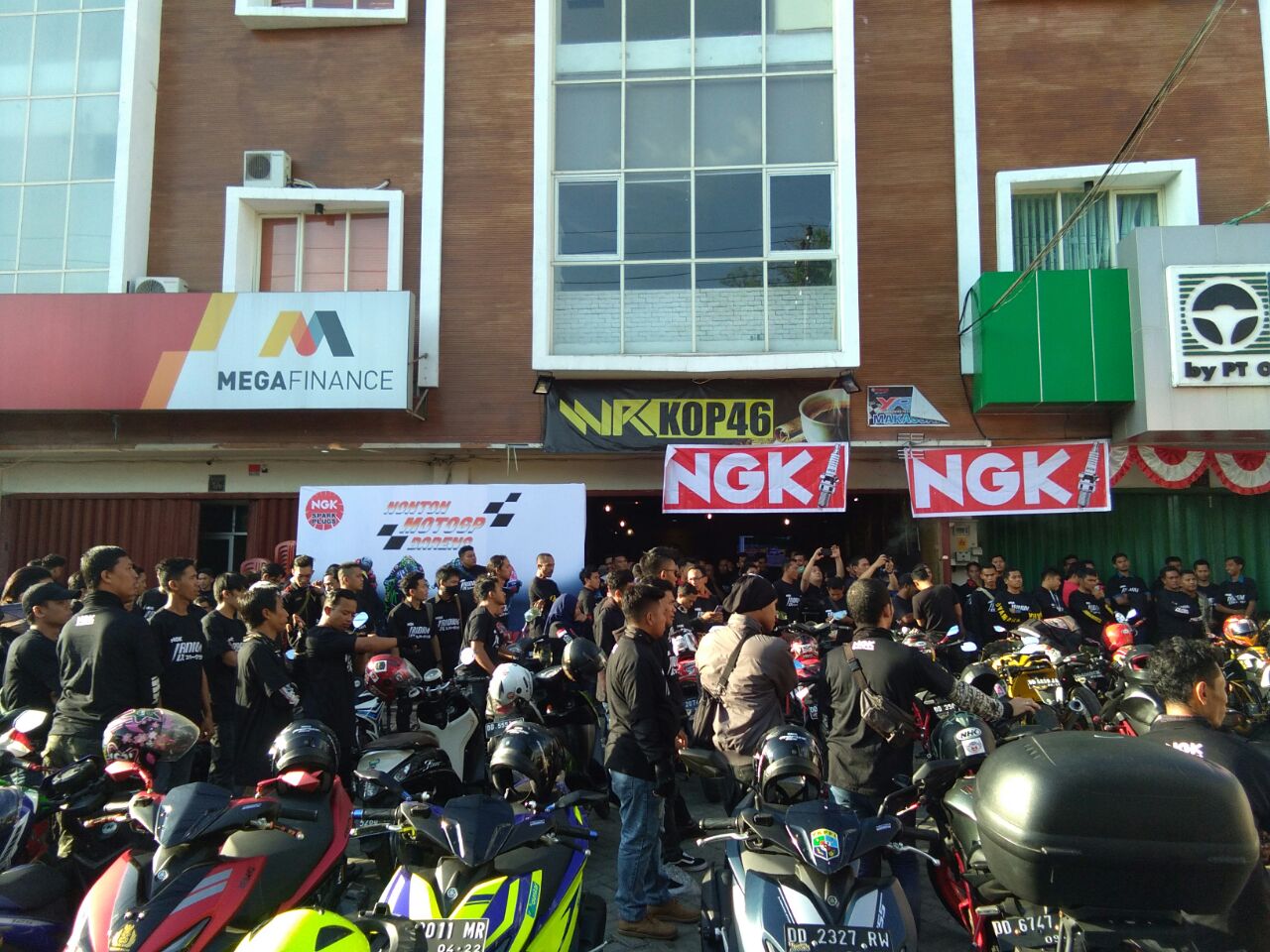 Di kota Makassar, keseruan balap motoGP kali ini dinikmati para komunitas roda dua bersama NGK. Nonton motoGP bareng yang diadakan di warkop 46 ini diikuti tidak kurang dari 300 bikers dari berbagai komunitas. Para bikers sudah berkumpul dari pukul 16.00 WITA untuk melakukan city touring dengan pengawalan kepolisian setempat.